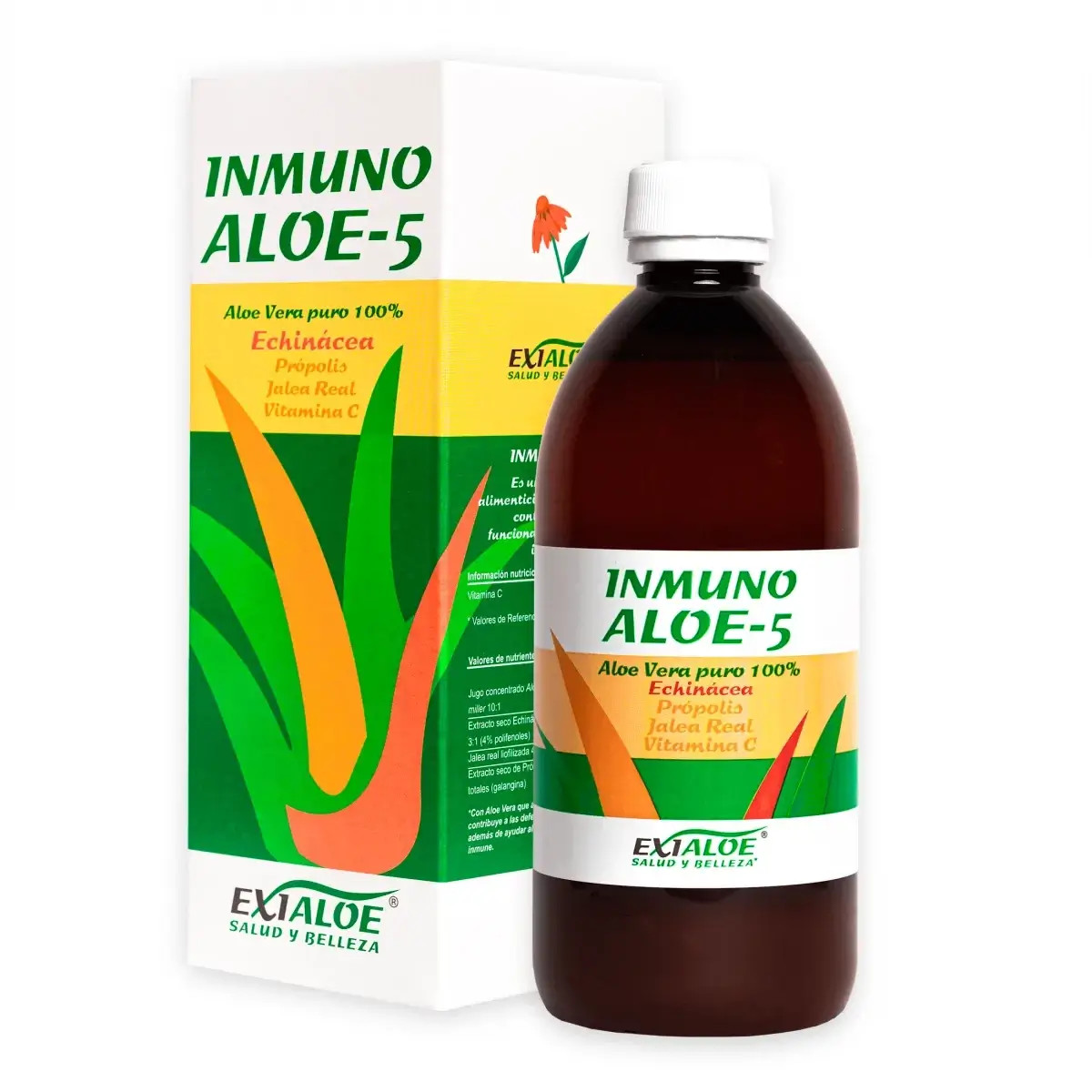 El Inmuno Aloe-5 es un complemento alimenticio natural que es revitalizante y sus ingredientes son, el jugo de Aloe Vera, Echinácea, Propóleo, Jalea Real y Vitamina C. Esta indicado para ayuda a prevenir y tratar infecciones, especialmente del tracto respiratorio superior.