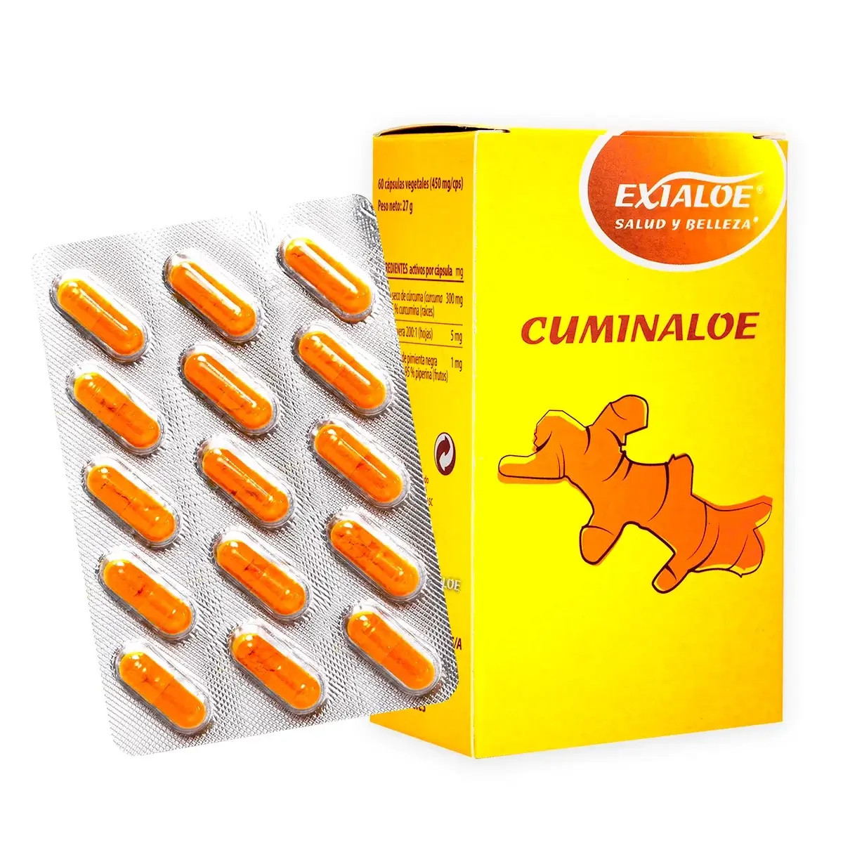 Cuminaloe son cápsulas cuyo principal componente es la Curcumina, extracto en un 95%. Procede de la planta cuyo nombre botánico es Cúrcuma Longa. Originaria de la India, China Sri Lanka, Taiwán y Filipinas, se conoce como el condimento principal del curry, que le da su color amarillo y sabor. No fue sino hasta hace tan solo 30 años cuando investigadores decidieron analizar sus principios activos para saber el porqué de su gran potencial curativo. Entonces descubrieron que su principal ingrediente activo es la curcumina. Esta se extrae de la raíz o tallo subterráneo de la planta.
