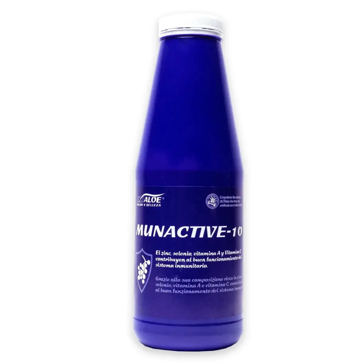 Munactive-10 es un zumo que debido a sus 10 componentes activos tiene importantes propiedades beneficiosas ya que actúa como alcalinizan de la sangre, antiinflamatorio y potente antioxidante que ayuda a evitar la formación de radicales libres y las enfermedades de generativas que pueden producir.